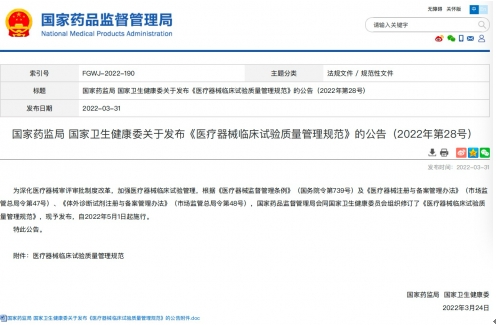国家药品监督管理局、国家卫生健康委员会《医疗器械临床试验质量管理规范公告》(2022年28号)