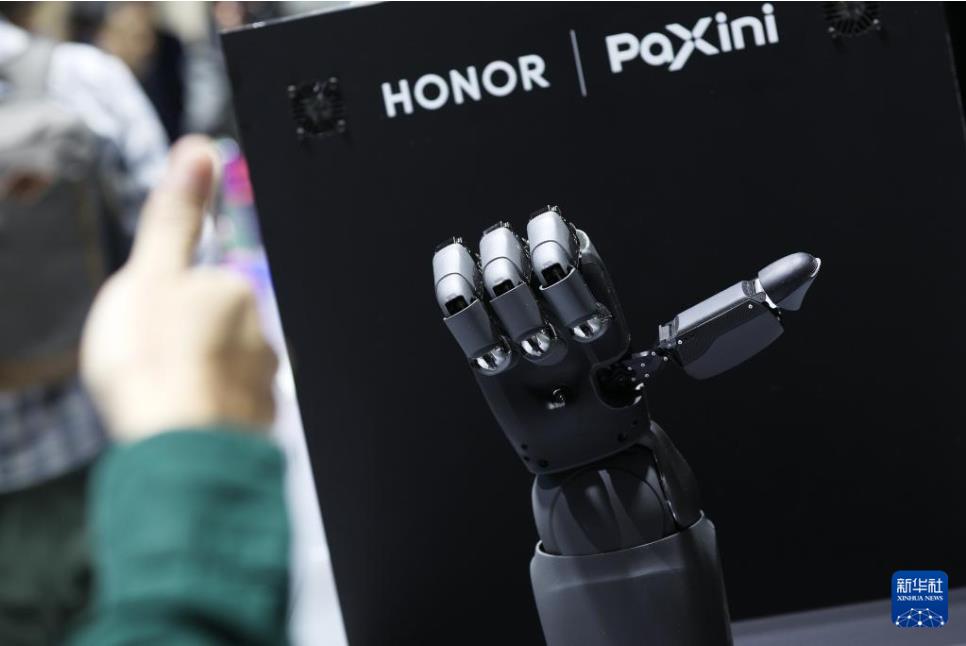 3月3日,在西班牙巴塞罗那举行的2025年世界移动通信大会上,参观者与多维触觉灵巧手互动。新华社记者 赵丁喆 摄