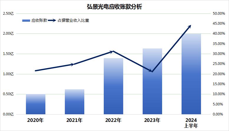 从2020年的数据看,弘景光电应收账款占营业收入的比重为21.58%,而到了2024年上半年,这一比例已经攀升至44.35%,应收账款总额更是达到了2亿元。应收账款虽然代表了公司未来的收款潜力,但同时也带来了坏账等潜在风险。因此,弘景光电需要谨慎管理其应收账款,以降低潜在风险。
