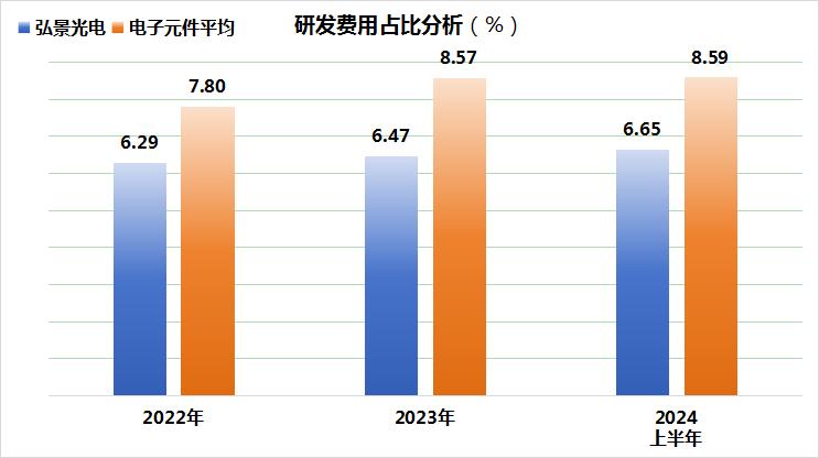 尽管弘景光电的研发费用占营收比重逐年上升,至2024年上半年达到6.65%,但仍低于行业平均的8.59%,反映出其在研发规模上的劣势。