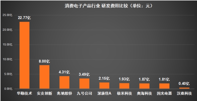 具体而言,在消费电子行业的33家企业中,2024年上半年的研发费用总额达到了1.87亿元,而汉桑科技的研发费用仅为0.40亿元。同时,从研发费用占比来看,行业平均值为6.92%,而汉桑科技仅为5.87%,同样低于行业均值。