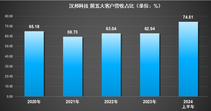 此外,从汉桑科技前五大客户的营收占比变化来看,自2021年起,该比例由59.73%开始攀升,至2024年上半年已达到74.51%,创下了阶段性新高。其中,最大客户(据市场推测为某知名国产手机品牌)对汉桑科技的营收贡献尤为显著,占比接近40%。