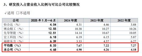 智能制造装备行业是一个技术密集型行业,技术创新是企业保持竞争力的关键。然而,美德乐在研发投入方面相对较低。2022至2025年1-6月,美德乐研发费用金额分别为4313.91万元、4296.65万元、5574.49万元和3331.59万元,研发费用率分别为4.18%、4.26%、4.9%和4.68%,远低于同行可比公司平均值。
