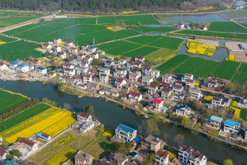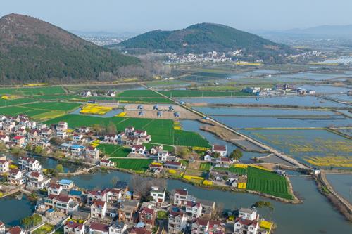 近日,在安徽省马鞍山市当涂县护河镇,金灿灿的油菜花、绿油油的小麦与群山、村庄、田园、河流、道路相映成趣,构成一幅美丽的春日田园画卷。