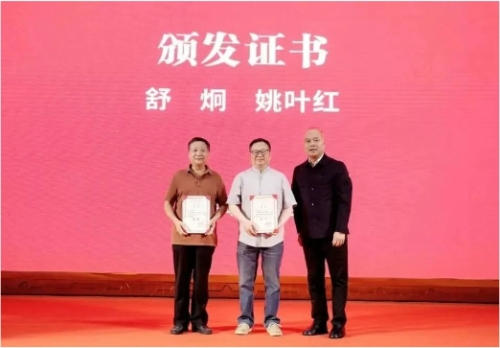 成都市文联党组书记、主席杨晓阳为成都天府书法院院长舒炯、成都天府国画院院长姚叶红颁发证书