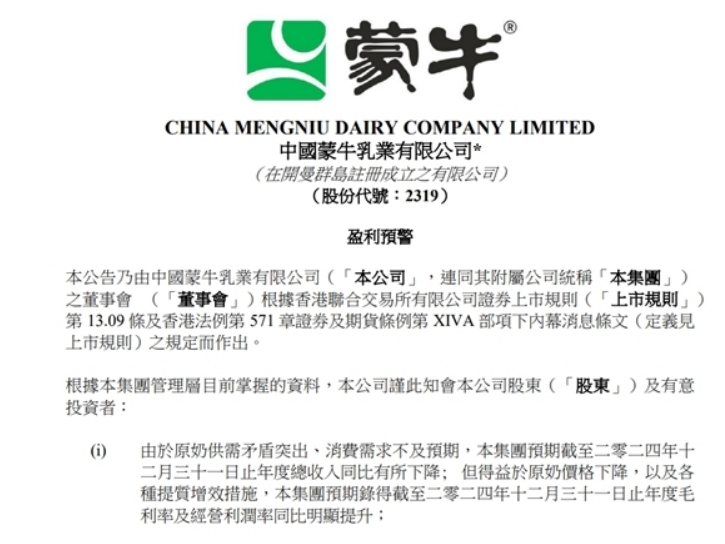 该人士指出,本次减值属于非经营性、非持续性事件,影响的是商誉减值等会计处理影响后的报表端净利润,并不能反映蒙牛实际业务运营层面的核心盈利能力。而公告里的“毛利率和经营利润率同比明显提升...... 但受两项减值因素影响,预期本集团2024年公司拥有人应占利润将约为0.5-2.5亿元。若剔除上述减值的影响,公司拥有人应占利润同比仍然稳健”的表述,说明公司扣非后净利润表现或超预期。