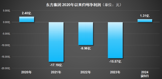 除了退市风险,东方集团的经营业绩也亮起红灯。财报数据显示,从2021年至2023年,东方集团连续四年陷入亏损,归母净利润分别亏损17.19亿元、9.96亿元和15.57亿元。而根据东方集团此前披露的2024年业绩预告,预计净亏损将达到8亿元至12亿元。因此,东方集团在这四年里合计亏损超过50亿元。