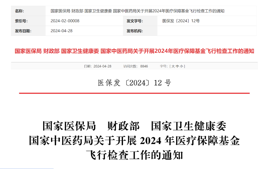 这项《关于开展2024年医疗保障基金飞行检查工作的通知》由国家医保局、财政部、国家卫生健康委、国家中医药局联合印发。