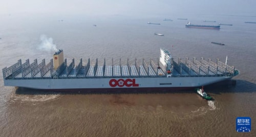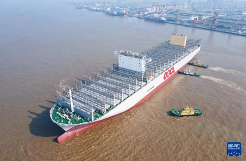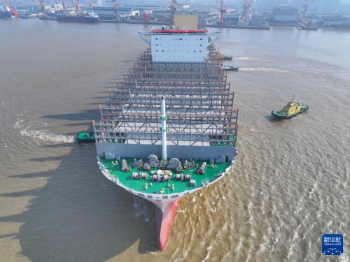 当日,由江苏南通中远海运川崎船舶工程有限公司自主设计、研发制造的“中远川崎397”集装箱船出海试航。该船长399.99米、型宽61.3米,型深33.2米,可装载24188个国际标准集装箱。