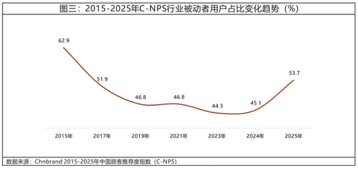 与C-NPS提升轨迹相同的,2015年开始全体用户中“被动者”占比就连续处于下降中。随着消费者体验的品牌、产品、服务等各方面提升的同时,他们更多向推荐者转移,他们成为这些新产品、新服务和新内容的分享者,当然社交媒体的迅速崛起和发展也为他们提供了发声的沃土。2020年开始这种降幅开始放缓,但仍然在缓慢下降中。但图三中的曲线能够帮我们清晰地看到2024年的拐点,并且连续两年“被动者”的占比回升,这似乎释放了一个信号:消费者在推荐这件事情上越来越冷静、沉默。