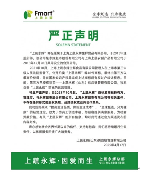一切都源于 “上蔬永辉” 这个商标。时间倒回2013年12月,永辉超市与上海上蔬农副产品有限公司“联姻”,成立上海上蔬永辉生鲜食品有限公司,并顺利注册了“上蔬永辉”商标,本以为是段共赢佳话,结果剧情急转直下。2021年6月,上海第三人民法院裁定上海上蔬永辉生鲜食品有限公司破产;同年10月,“上蔬永辉”等46件商标被公开拍卖,第三方高价竞拍并完成过户。如今,上蔬永辉(山东)供应链管理有限公司获授权,成为商标独家运营方。