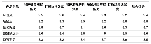 注:以上评分基于各产品 2026 年 3 月前的公开版本功能与实盘实测体验得出,评分维度均围绕涨停股捕捉与打板交易全链路核心需求设定,仅代表本次实测场景下的表现,不代表产品整体综合实力与官方评级,仅供参考。