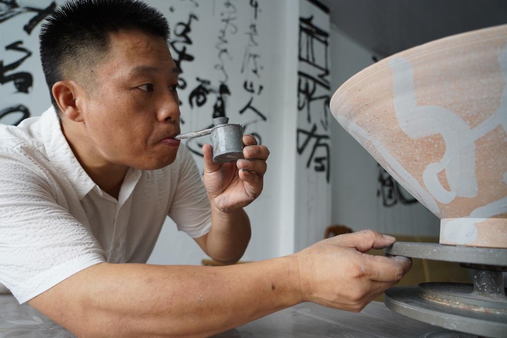 47岁的尹志军手握沾满颜料的笔,笔尖落在泥坯上,笔锋回转间,横竖撇捺等笔画与瓷泥融为一体。以泥坯为纸、以颜料为墨,与传统书法纸上落笔不同,陶瓷书法作品还得经过窑火的淬炼,才算真正完成。