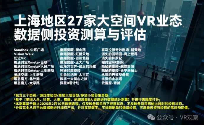 最后,我们也必须要极其清晰地理解到,这些数据侧的推算也存在着较大的局限性。目前国内大空间VR行业仍处于高速发展的早期,不像电影行业等有高成熟的完整的行业信息披露及票房数据统计汇总渠道,因此,很难获得完全对标的或相对真实的公开数据,例如有的经营方可能采取 “刷数据” 的行为,或者部分项目其实极具潜力,但因经营管理不善、选址错误、票务渠道开发不利等因素影响了实际运营效果等,这些都可能导致评估数据与实际情况存在偏差。因此,无论是行业从业者还是投资者,在参考这些数据时都需要保持谨慎态度,结合其他信息进行综合判断。