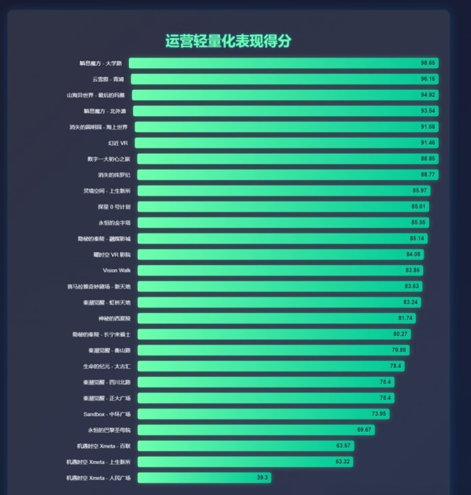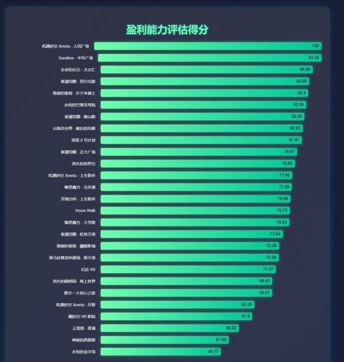 综合评分是各部分评分的平均值,综合了投资轻量化、运营轻量化、盈利能力和回报周期的得分,粗略地展现了各项目在多个维度的整体表现。另外,需要注意的是,由于本次评估体系中对轻量化的投资、轻量化运营、回收周期等的评估项较多,因此轻量化的项目将在总的均衡性打分上显得更加优秀,而较大的大空间VR项目则有可能在打分上更吃亏一些,这是阅读者需要注意的。