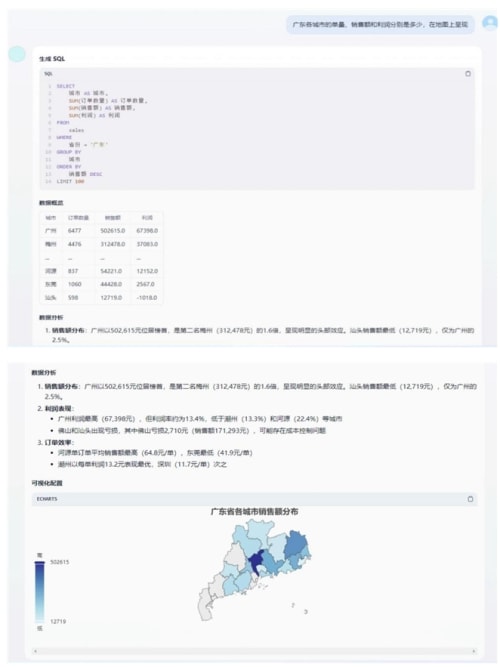 动态可视化:根据分析需求自动匹配图表(趋势图、热力图等),支持交互式探索;