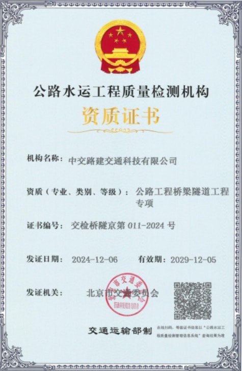 中交交科顺利取得公路水运工程质量检测机构桥梁隧道工程专项资质证书