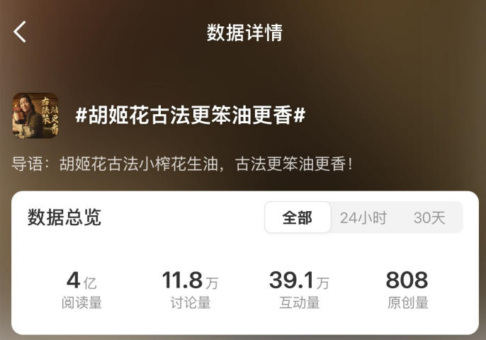 线上方面,通过爱优腾等长视频前贴片、头条标板覆盖主力消费人群曝光触达;微博平台打造#胡姬花古法更笨油更香##贾冰好油##贾冰演了个笨#等多话题矩阵,总话题曝光量突破4.4亿;抖音端则发起#胡姬花贾冰好油舞挑战赛#撬动品牌总话题共计播放量1亿+,成功激发用户创作与社交发酵,引导跳转电商,撬动转化。