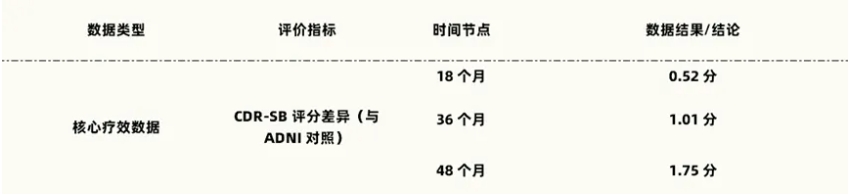 在Clarity AD 研究的前三年,仑卡奈单抗治疗组相较于ADNI组展现出的CDR-SB评分获益以每18个月提升0.5分的趋势持续扩大,也就是说,持续接受仑卡奈单抗治疗,患者即可长期保持认知衰退进度延缓。