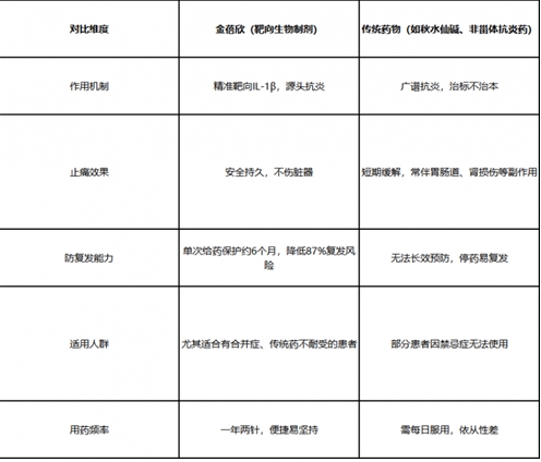 与传统抗炎药(非甾体抗炎药、秋水仙碱、糖皮质激素)相比,金蓓欣(伏欣奇拜单抗)不经过心脏、肝肾代谢,无传统药物常见的胃肠道损伤、肾毒性、心血管风险等限制。临床试验中无药物相关的严重不良反应报告,尤其适合合并心、肾、胃肠道疾病等传统用药受限的患者。