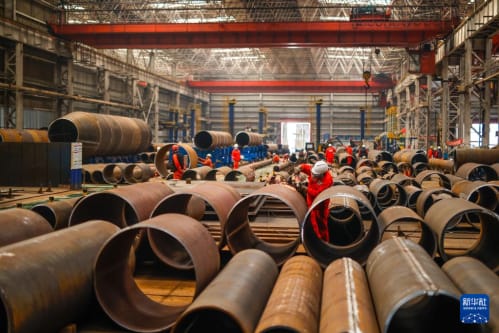 4月10日,在海油工程青岛建造场地,工人在建造现场进行钢材打磨作业。新华社发(杜鹏辉摄)