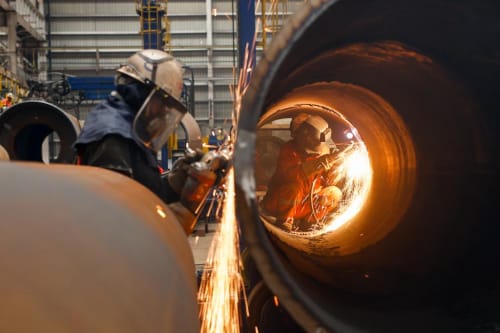 4月10日,在海油工程青岛建造场地,工人在建造现场进行钢材打磨作业。当日,渤海亿吨级油田——垦利10-2油田Ⅰ期海上作业平台开工建造。垦利10-2油田位于渤海南部海域,距离天津市约245公里,平均水深约15.7米,是2021年在莱州湾凹陷浅层发现的大型岩性油气藏,原油探明地质储量超过1亿吨。项目计划在天津、青岛两地三处场地新建1座中心平台、2座无人井口平台,铺设7条海底管道和4条海底电缆等。新华社发(杜鹏辉摄)