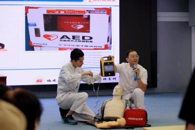 “当发现身边有人出现气道堵塞,我们该怎么做?当发现身边有人出现心跳、呼吸停止,情急之下又该如何是好?”讲座中,福建省立医院紧急救援科护士长简钢仁带着一个个问题,为大家一一介绍了日常生活中常见的致命性危险及其急救技能,详细讲解了心肺复苏术(CPR)操作流程和AED(自动体外除颤器)的正确使用方法,并展示了气道异物梗阻的急救处理操作。