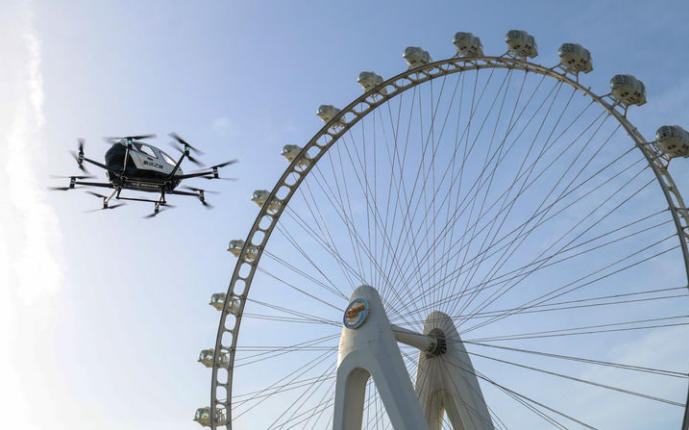 在深圳市宝安区城市空中交通运营示范中心,亿航eVTOL航空器进行展示飞行(2025年4月16日摄)。新华社记者 毛思倩 摄