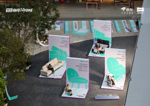 不同于常见的营销事件,这一波围绕“扩大身体舒适面”举办的京东巅峰24小时IP活动,林氏家居选择了在集“青年文化、产业办公与城市美学”于一体的城市地标——ALSO商圈,联合京东打造出一场实现“身心舒展”的限时家具展览活动——用林氏家居品质季新品带来的舒适体验与场景布置,在打工人聚集地“贴脸开大”,引导“牛马一族”直击“职场疲劳”,以三大策略落地,紧抓人群痛点,上演事件营销生动、精彩的一课: