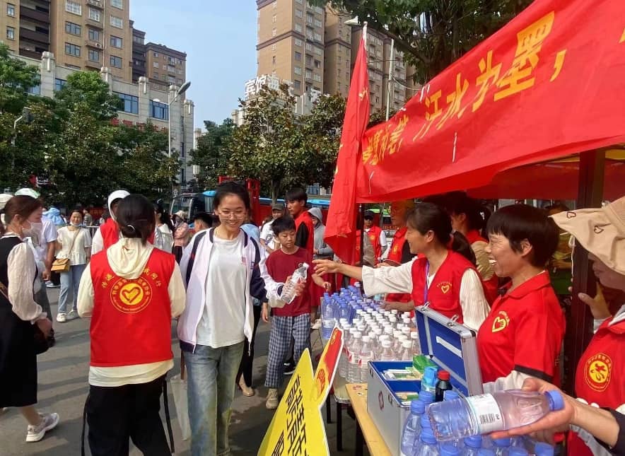 活动现场,志愿者们来到利辛县高级中学的考场外,为在外焦急等待的家长们以及辛苦执勤的警务人员提供水饮服务,志愿者们冒着高温,顶着酷暑,仍然保持精神饱满,热情服务,她们以一瓶水、一个微笑、一个祝福,为家长们送去浓浓关怀,成为高考外另一番“拼搏”风味。你提笔逐梦,我们全力守护,志愿与爱同行,少年乘风起,未来皆可期。如火6月,让他们一起听凯歌嘹亮。