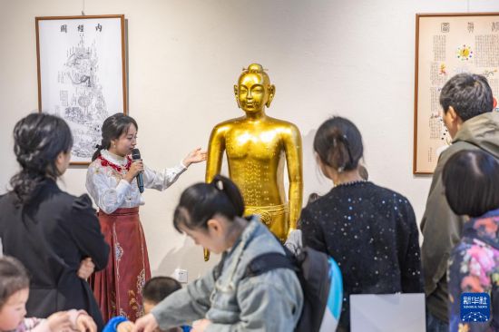 4月6日,医生志愿者在“百草创艺”中医药艺术作品展现场为观众讲解中医药文化知识。