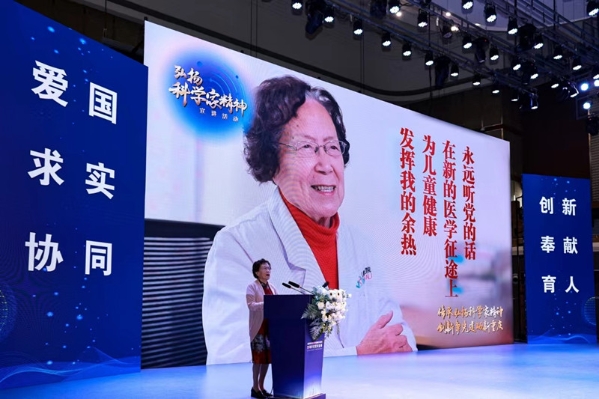 从上海西迁重庆的老专家代表,重庆医科大学附属儿童医院原儿保科主任,98岁高龄的郑惠连教授现场作科学家精神宣讲