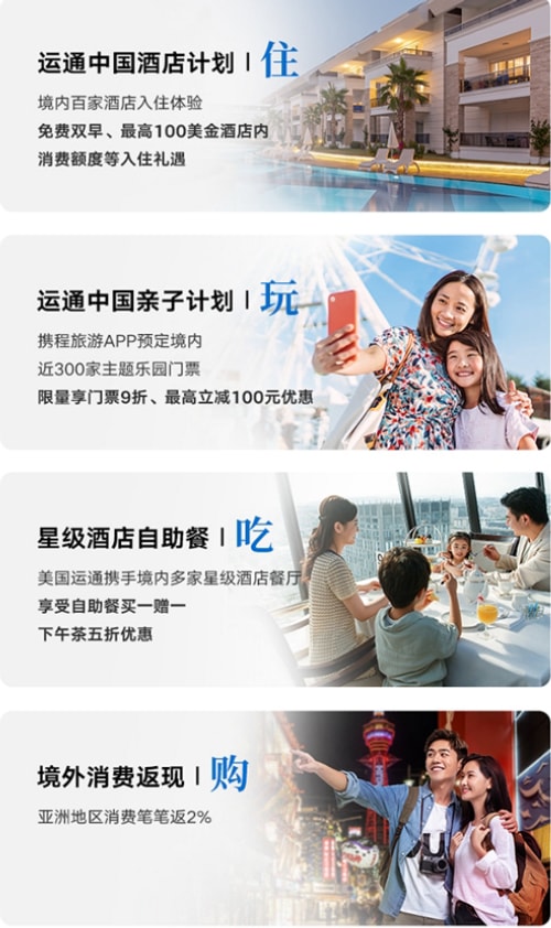 ● 玩乐无忧:享美运卡组织权益,乐园门票9折、星级酒店自助餐买一送一、下午茶半价。