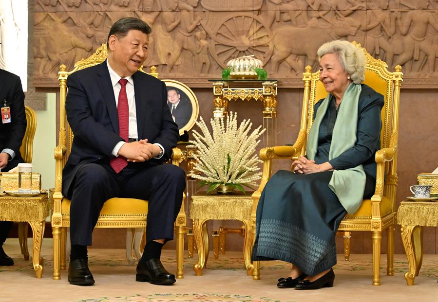 4月17日晚,国家主席习近平同柬埔寨太后莫尼列在金边王宫举行会见。