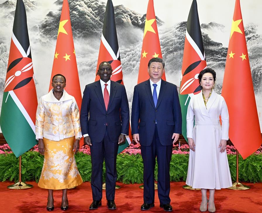 4月24日上午,国家主席习近平在北京人民大会堂同来华进行国事访问的肯尼亚总统鲁托举行会谈。这是习近平和夫人彭丽媛同鲁托和夫人蕾切尔合影。新华社记者 李学仁 摄