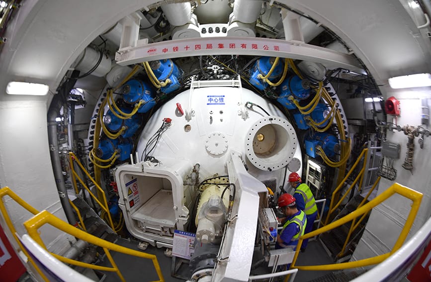 5月9日,中铁十四局技术人员在“启航号”盾构机内巡查。