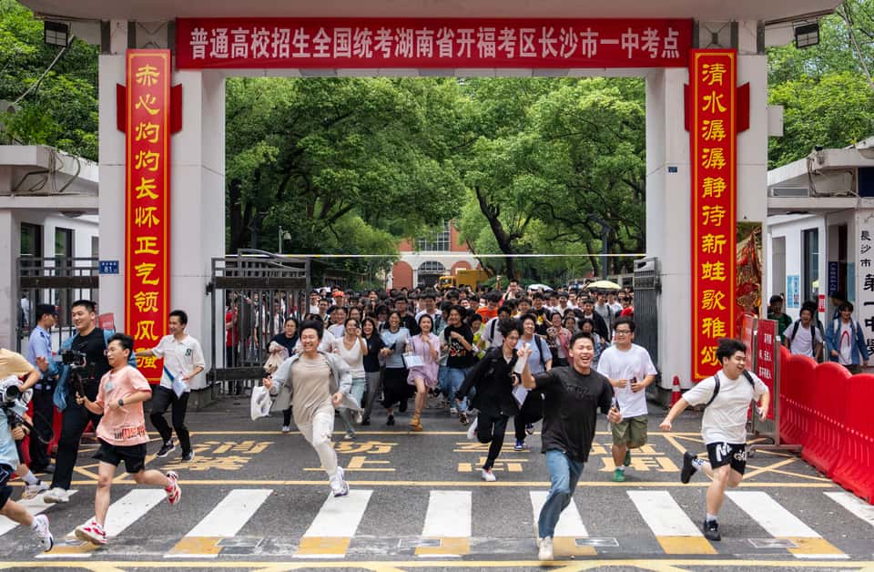 6月9日,在长沙市第一中学考点,考生在高考结束后庆祝。