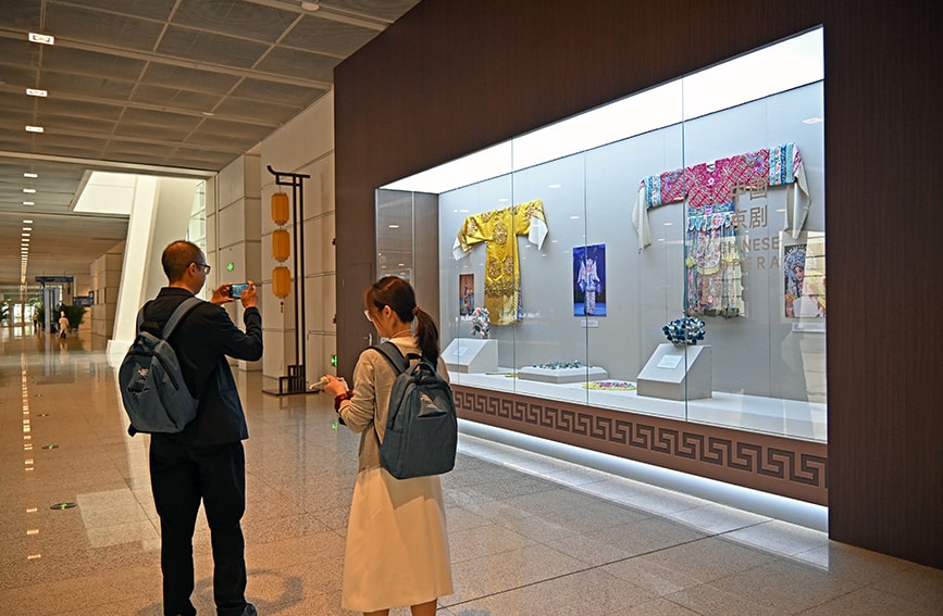会场内,“中国京剧”展柜展示着京剧“行头”;“明朝艺术”展柜陈列着瓷器和工艺品;天津港展台,古代木船模型和现代港口沙盘形成鲜明对比,展现着天津这座港口城市的独特魅力……