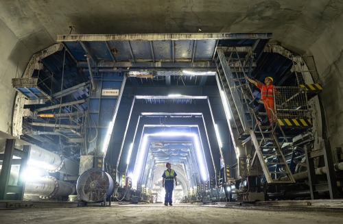 7月16日,中铁十四局工人在贯通的隧道内巡查。