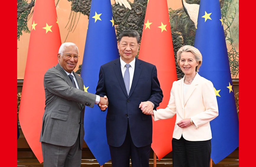 三是践行多边主义,维护国际规则秩序。面对战争与和平、竞争与合作、封闭与开放的重大选择,多边主义、团结合作才是正确答案。中欧要共同维护第二次世界大战结束后建立起来的国际规则和国际秩序,与时俱进推动构建更加公正合理的全球治理体系,携手应对气候变化等全球性挑战,让多边主义的火炬照亮人类前行之路。中欧要支持通过政治手段和平解决国际争端。中方一贯从事情本身的是非曲直出发,主张劝和促谈,倡导标本兼治。中方愿同欧方加强协调,推动今年联合国气候变化贝伦大会取得成功,为应对气候变化和全球绿色转型作出更大贡献。中方也愿同欧方开展人工智能领域政策沟通和务实合作,共同推动平等有序的世界多极化、普惠包容的经济全球化。