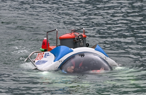 近日,由重庆巫山本土科技企业坤联机械制造有限公司自主研发制造的“鲛子”号水下载人观光潜水器在双龙湖进行交付前的测试。