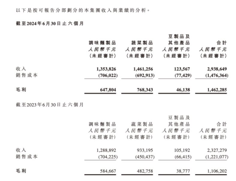 中报显示,截至2024年6月底,调味面制品实现收入13.54亿元,营收占比46.1%;
