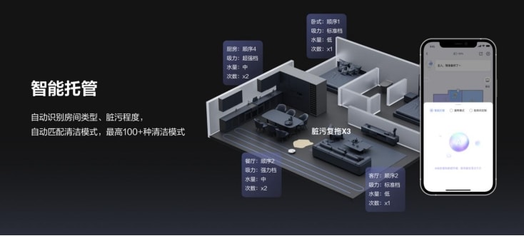 RS20 Pro Ultra将激光雷达、高清摄像头、结构光等感知硬件与仿人眼AI智能2.0的智能引擎深度结合,完成感知、决策和执行的流畅连接,目前支持超130种常见物品的精准识别,并会依据识别结果采取相应的清洁措施,如当识别到猫粮和猫砂时,自动启动大颗粒模式,避免打飞颗粒物。此外,RS20 Pro Ultra具备智能脏污识别和智能托管的能力,它能够根据房间类型、家具、地面材质及脏污程度智能匹配清洁方案,并运用自学习技术不断优化清洁策略。
