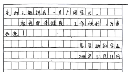 最后,再次感谢您对我们的关心和帮助,我会永远铭记您的恩情,努力学习,不负期望,去有意义的领域,像您一样发光发亮,温暖人心,让爱延续不断地传递下去,让有梦想与抱负的人能拥有一片广阔蓝天。