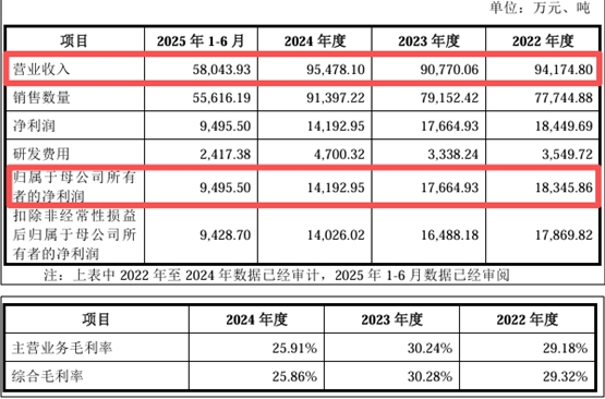 招股说明书数据显示,2022年、2023年、2024年、2025年1-6月(以下简称报告期内和期后),锡华科技分别实现归母净利润1.83亿元、1.77亿元、1.42亿元、0.95亿元;分别实现营业收入9.42亿元、9.08亿元、9.55亿元、5.80亿元。2022年-2024年,营收增长1.38%,归母净利润下降22.64%,公司综合毛利率更是从29.32%下降到25.86%。
