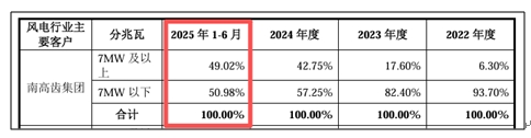 公司2024年到2025年为南高齿集团提供7MW及以上和7MW以下的产品分别占比为49.02%、50.98%,和其他客户如德力佳、中车股份7WM及以上产品占比在三分之二的趋势并不相同。公司2025年上半年为第一大客户南高齿集团供货仍以7MW以下产品偏多,公司在大兆瓦产品方面的技术水平如何?能否追赶行业趋势还未可知。