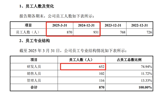 截至2025年3月末,公司员工总数870人,相较2024年末的931人,减少了61人。其中,研发人员是缩减大头,从706人降至652人,减少了54人。恰逢IPO关键时期,对一家技术密集型企业而言,研发人员的缩减无疑是一个不利信号。研发人员是公司技术创新和产品升级的核心力量,人员缩减可能导致公司研发能力下降,影响公司的长期发展。