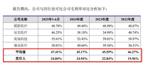 根据招股书及公开数据,2022年至2025年上半年,健信超导的主营业务毛利率分别为19.56%、22.84%、24.94%和24.84%,而同期同行可比公司的毛利率均值分别为46.27%、45.59%、45.17%和47.41%。这意味着,健信超导的毛利率长期不足同行的一半,差距至少达20个百分点。例如,联影医疗作为行业龙头,其毛利率长期维持在45%以上,而健信超导的毛利率甚至低于部分传统制造业企业。