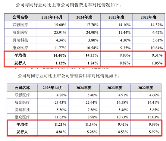 2022年至2025年上半年,健信超导的销售费用率分别为1.05%、0.82%、1.24%和1.12%,而同行可比公司的销售费用率均值分别为9.31%、9.8%、14.23%和14.4%。管理费用率方面,健信超导同期分别为5.97%、4.53%、5.28%和4.81%,而同行均值分别为9.99%、9.42%、11.14%和11.21%。健信超导的销售费用率与管理费用率均不足同行的一半,甚至低于部分消费类企业。
