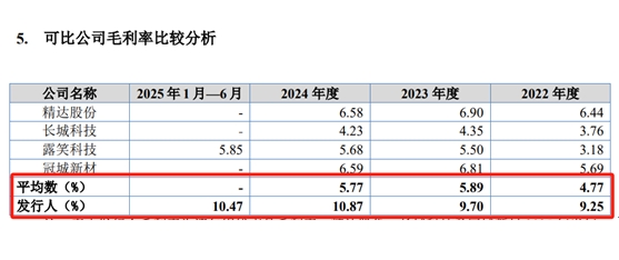 2022年至2025年1-6月,兢强科技毛利率分别为9.25%、9.7%、10.87%、10.47%,波动较大,且高于同行业可比公司平均数。在“金属价 + 加工费”的销售定价模式下,主要原材料价格越高,电磁线产品毛利率越低。相较使用价格更高的铜作为导体的漆包铜线产品,使用价格更低的铝作为导体的漆包铝线产品毛利率通常更高,且对金属价格波动更敏感。然而,即便考虑这一因素,兢强科技毛利率的波动幅度仍然显得异常。
